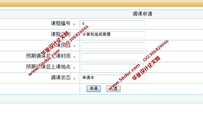 (2)调课申请模块:教师根据本人工号及密码登陆系统后,系统自动调用教务网络管理系统中教师本人课表,显示课程名称、授课班级、上课时间地点等必要信息。教师可根据自己调课意愿选择调课目及节次,填写调课申请单,注明调课原因及预期调课结果,在提交调课申请后,等待管理部门的审批。