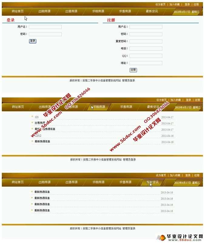 注册用户登录后:可以查看房源信息,修改自己的资料,密码,也可以查看网站的最新资讯,
