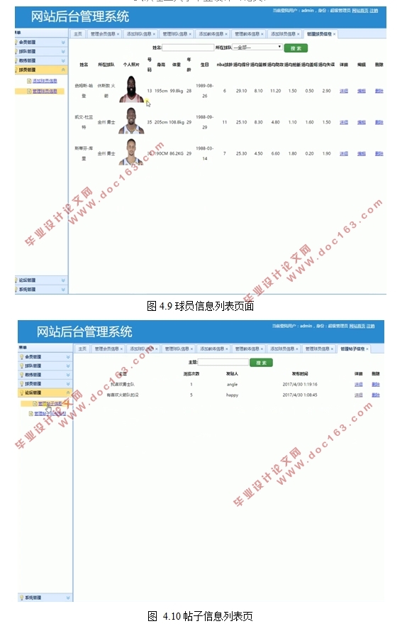 1、网页显示各类信息及所有功能信息模块,面向所有用户,功能模块包括对单个球员球队教练的搜索查看,以及对各项数据排名的查询。论坛界面,面向会员,会员可发帖删帖;