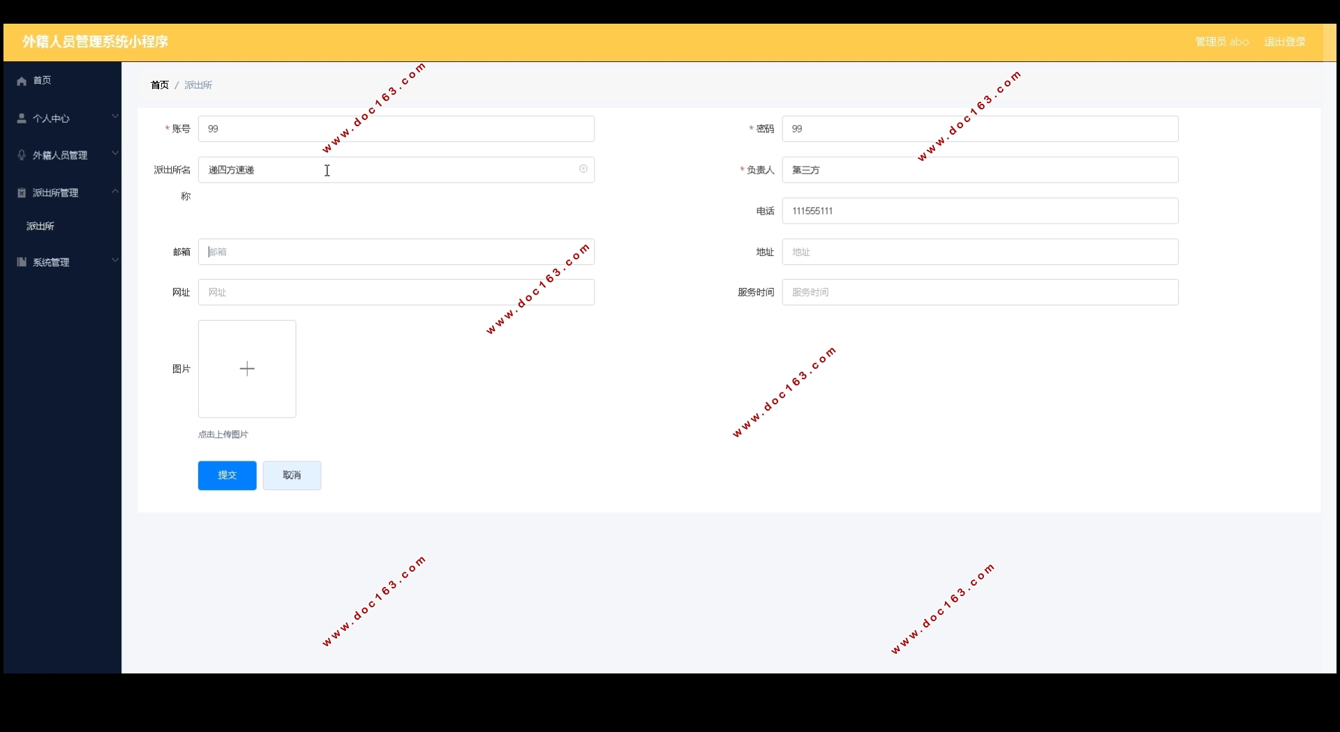 管理员进入后台页面,可以查看个人中心、外籍人员管理、派出所管理、系统管理等功能模块进行查看操作。
