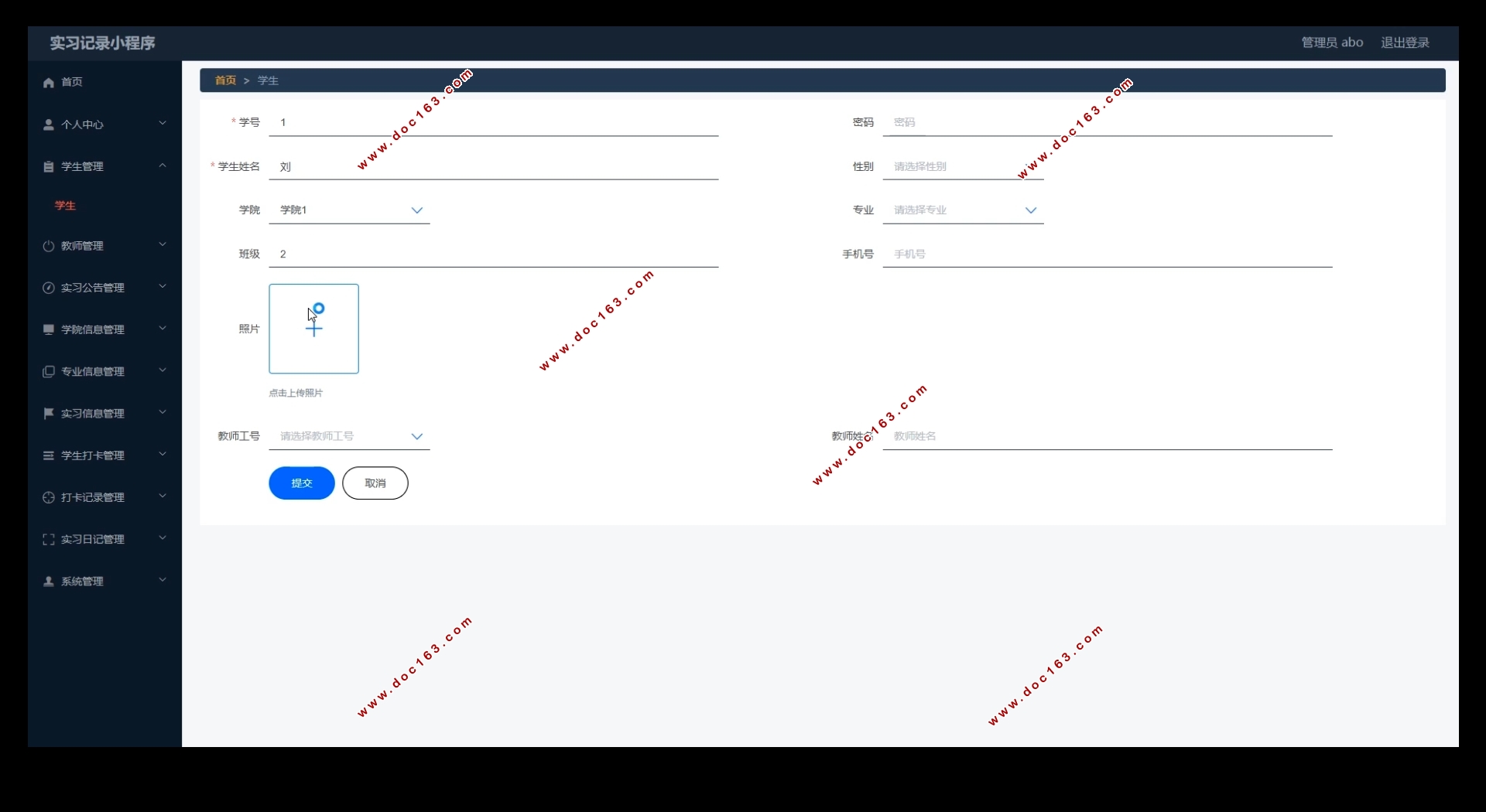 实习记录在系统的安卓手机上可以运行,主要实现了管理员后端;首页、个人中心、学生管理、教师管理、实习公告管理、学院信息管理、专业信息管理、实习信息管理、学生打卡管理、打卡记录管理、实习日记管理、系统管理,教师前端;首页、实习公告、我的,学生前端;首页、实习公告、我的等主要功能模块的操作和管理。