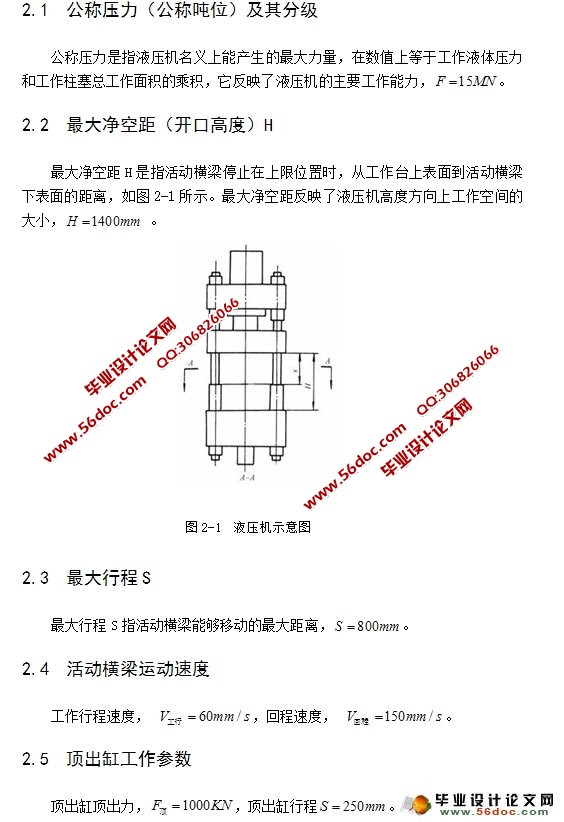 最大净空距H是指活动横梁停止在上限位置时,从工作台上表面到活动横梁下表面的距离,如图2-1所示。最大净空距反映了液压机高度方向上工作空间的大小, 。
