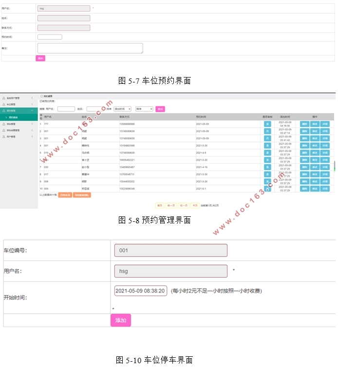 用户预约车位模块主要实现的是对车位的预约功能,通过查看自己的预约记录,也可进行取消预约操作。管理员登录系统后,可查看用户的预约信息,也可搜索预约信息,同时可对预约信息进行确认或删除的操作。
