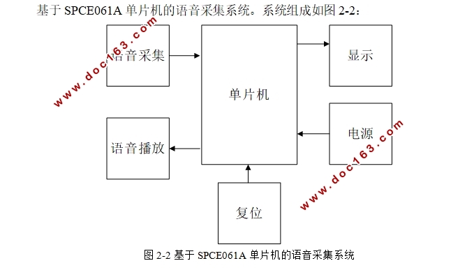In this essay, the plan of the whole design will be explicitly introduced. The essay has been divided into several modules to introduce some basic functions and work principles of the speech acquisition system based on SCM. The key SCM in the plan is SPCE061A produced by Ling Yang Corporation. Here are its peripheral circuits: the module of electret microphone speech acquisition the module of small loudspeaker voice prompting the module of LED display the module of power source the module of reset. The result will be displayed by voice prompt and LED through single chip storage after the speech signal has been acquired and the comparison of treatment has been made. In this essay, the organization and function of each module and the design of soft hardware will be explicitly analyzed.