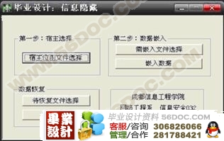 软件需求大体描述为如下:主体模块包括信息嵌入模块和信息恢复模块;功能模块包括宿主文件的正确选取,待隐藏文件的正确选取,融合过程的成功进行,融合后文件的正确选取,恢复过程的成功进行五大部分。对于用户来说,仅可以选择非空BMP位图文件作为宿主文件,因为大小为0kb的文件不能作为宿主文件使用,软件会提示宿主文件选取错误;选取待隐藏文件时,各种文件类型均可选取。若选取的文件过大,超过宿主文件大小的3/8,软件会提示待隐藏文件大小过大。因此本软件更适合隐藏容量较小的图像文件和文本文件;融合过程的成功进行取决于文件标头长度和融合系数的选择,一般情况下,文件标头对于融合过程的影响不大,而融合系数在软件原有程序中已确定;恢复文件时,需正确选取融合后的文件,否则软件会提示选取文件有误。